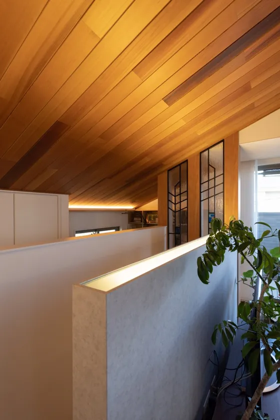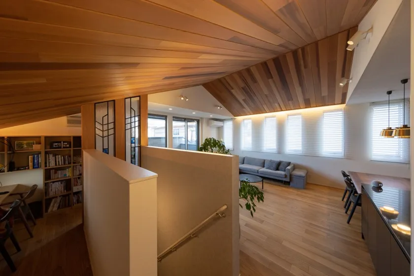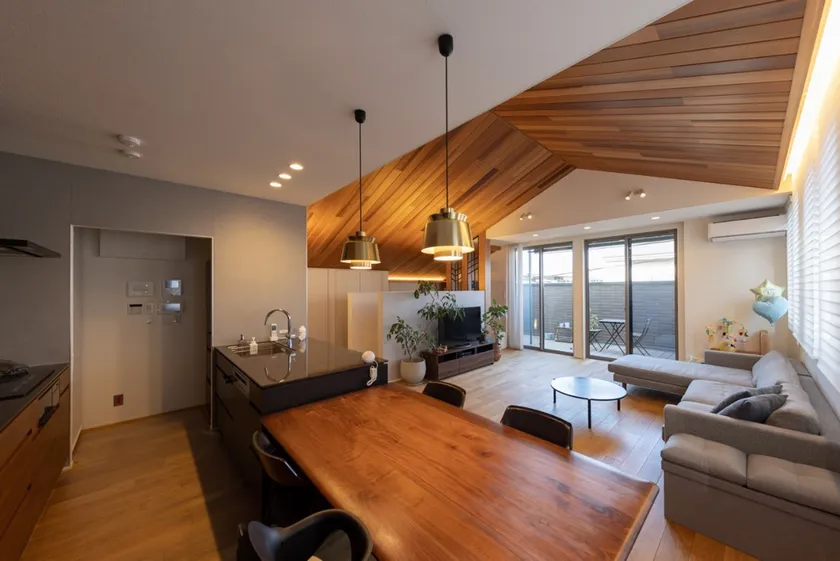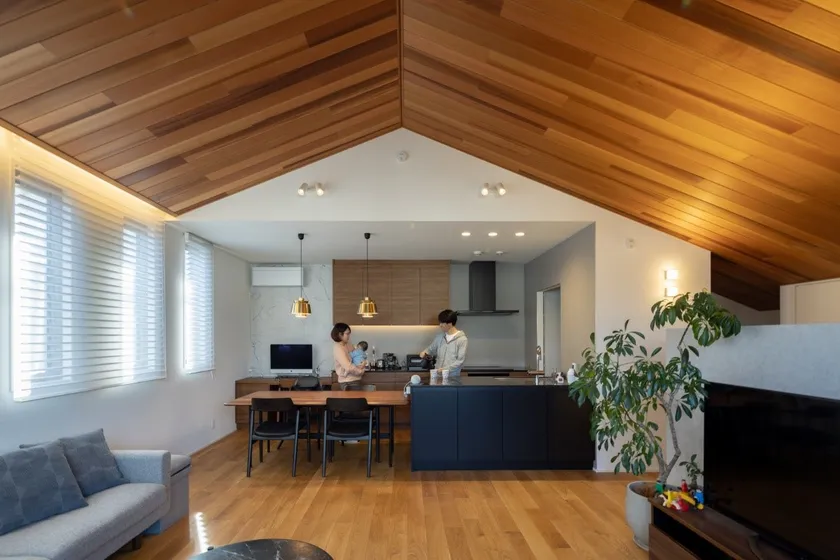 開放感のある2階のLDKでは、家事、仕事、読書など、ご夫婦がそれぞれの過ごし方をしながら、緩やかに家族の気配を感じることができます。また、家全体に回遊性を持たせることで、使いやすく生活しやすい間取りの工夫も盛り込まれています。