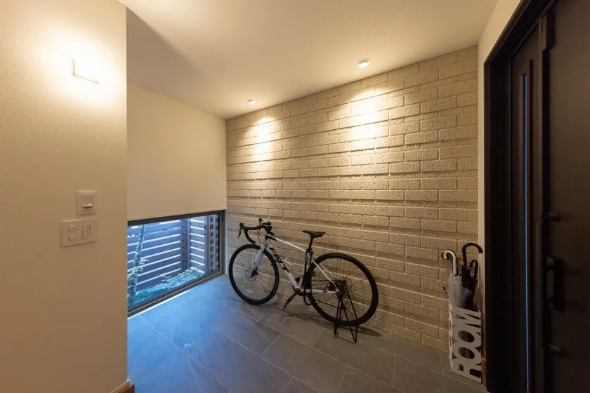アクセントタイルが張られた玄関の地窓からは木陰がのぞく