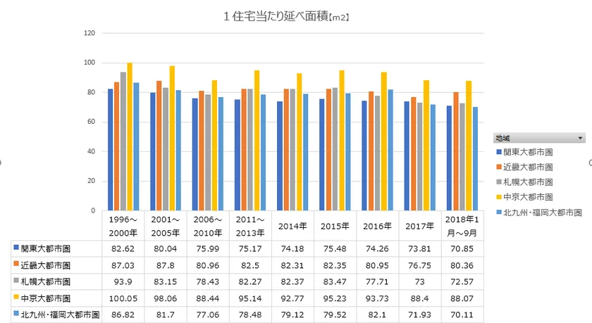 政府の統計によると、5大都市圏(札幌、関東、中京、近畿、北九州・福岡)での1軒あたりの住宅の平均面積は、2018年1月~9月時点で、70.11(北九州・福岡)~88.07(中京)平方メートルとなっています。ところが、1996年以降、平均面積は、全ての地域において減少傾向にあります。※1
