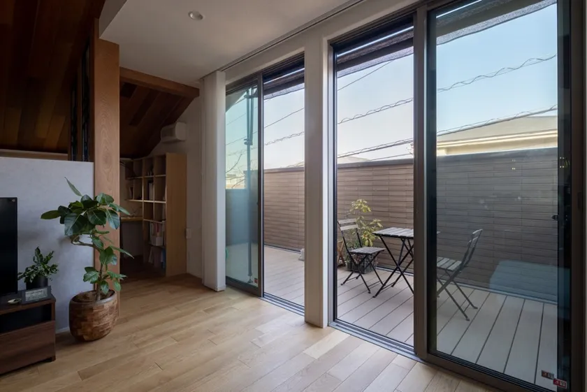 フルフラットバルコニーで光を取り入れ、ハイウォールでプライバシーを確保