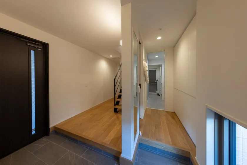 玄関からの裏動線:シューズクローゼットや壁面収納を通り浴室へ