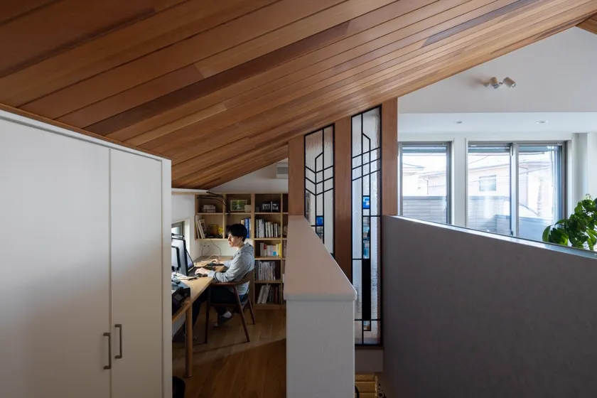 階段とステンドグラスでリビングから緩やかに仕切られた書斎コーナーは、夫・Y様の大の気に入り。回遊廊下にあるため使いやすく、奥まった位置で天井が低い中、自然光が入ることから、家族の声を聞きながも読書や仕事に集中できるそうです。