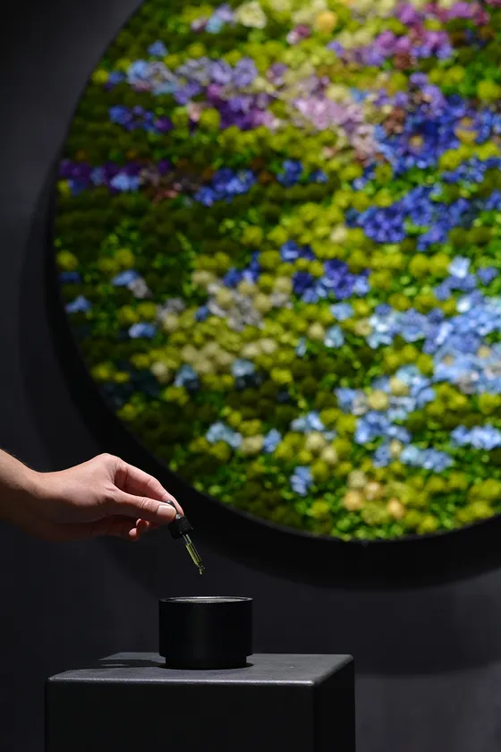 窓の外に広がる景色をアートフラワーで描く「円窓」は、絵画のように壁に掛けた状態で鑑賞いただく作品です。一輪ずつ挿された花によって構成される世界は、架空の光景でありながらもどこか懐かしく、静穏で、誰しもがそっと心に秘めている原風景を想起させるような美しい色彩が特徴。そして、作品の傍らには熱や水を使用せず風の力で香りを届けるWEEK ENDのディフューザーを設置。香炉のようにミニマルで洗練された佇まいの装置に「景色の香りの元」をひと雫垂らせば、円窓の向こうの景色に咲く花々を思わせる香りが空間をふわりと優しく包み、目前に広がる美しい光景をよりリアルに感じることができます。