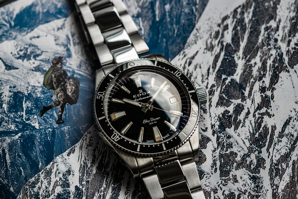 『スカイダイバー』は、半世紀前に使用されていた軍用時計を復刻したコレクションです。1973年にスイス軍・精鋭パラシュート部隊の大佐が、陸・海・空のいかなる環境下でも使用できるタフでハイスペックな軍用時計の生産を、極秘でエドックスに依頼しました。エドックスの工場の書庫でデザイン画が発見されたことでその存在が明らかとなり、2019 年に創業 135 年を記念し、復刻コレクションとして『スカイダイバー』を発表しました。当時のデザインを忠実に再現すると同時に、最新の技術や素材を随所に採用したタイムピースに仕上がっています。