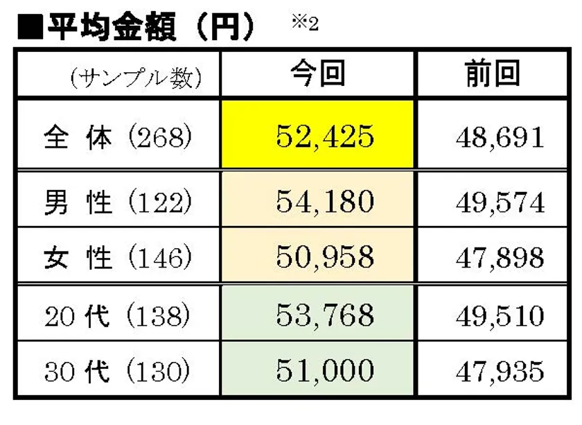 平均金額は、全体では52,425円(※2)でした。男性は54,180円、女性は50,958円と男性の方が僅かながら高い傾向にあります。