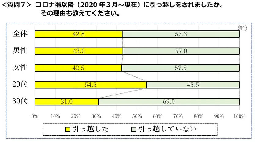 コロナ禍が始まって以降(2020年3月~)、現在までに引っ越しを「した」が42.8%、「していない」が57.3%でした。