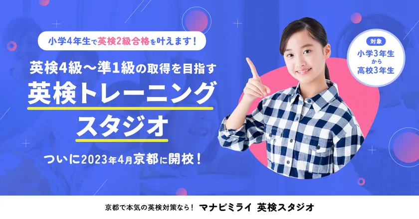 マナビミライ株式会社(本社:京都府京都市、代表取締役:影浦 誠士)は、“小学4年生で英検2級合格メソッド”をコンセプトに当社が企画・運営するマナビミライ英検スタジオにて、2023年4月末までのご成約で入会金半額、教材費無料となる『京都四条烏丸校開校キャンペーン』を開始いたしました。