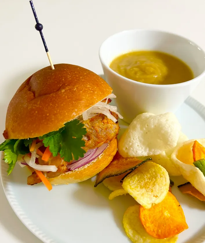 じっくりと丁寧に焼き上げたスパイスの旨味たっぷりのタンドリーチキンに、歯ごたえシャキシャキのなますを添えたバーガー(パクチーのトッピングはお好みでお選びいただけます)