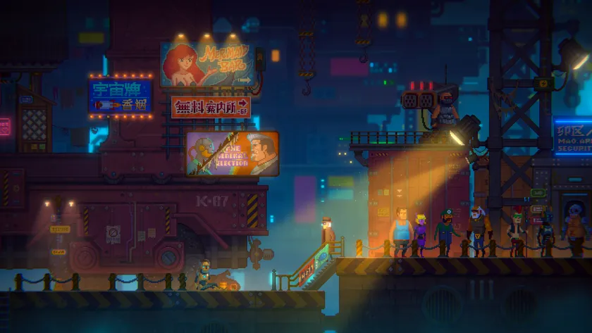 色鮮やかなドット絵で描かれた、魅力的でミステリアスなサイバーパンクの街。そびえ立つ高層ビルからホログラフィックプロジェクションの花びらまで、すべて8ビットピクセルで表現され、印象的な光と影の効果で、新しい視覚効果を生み出しています。