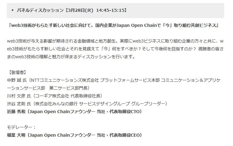 NTT Comは、3月28日~31日に開催される日本経済新聞社、金融庁主催「FIN/SUM2023 〜フィンテック、『シン個人』の時代〜」のパネルディスカッションに登壇します。テーマは『web3技術がもたらす新しい社会に向けて、国内企業がJapan Open Chainで「今」取り組む共創ビジネス』となっており、28日の14:45-15:15で登壇を予定しています。