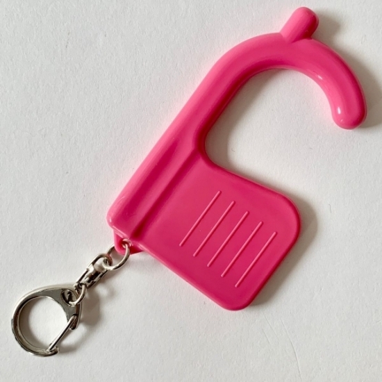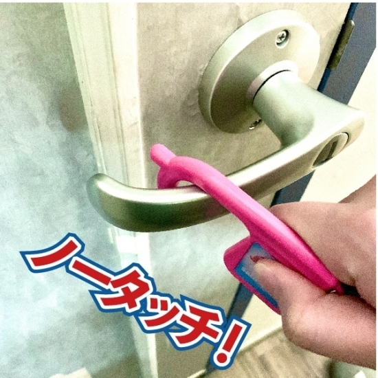 このように、ドアノブに引っかけて使えば、不特定多数の人が触ったところも気にせず開けられちゃいますよ。