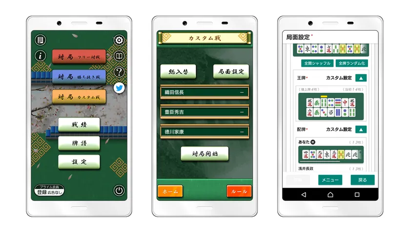 「カスタム戦」は、ユーザーが自由に設定した局面(起家・場・局・本場・供託・点数・チップ・焼き鳥・賽の目・牌山)を楽しむことができる画期的なモードとなっております。