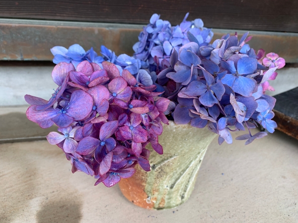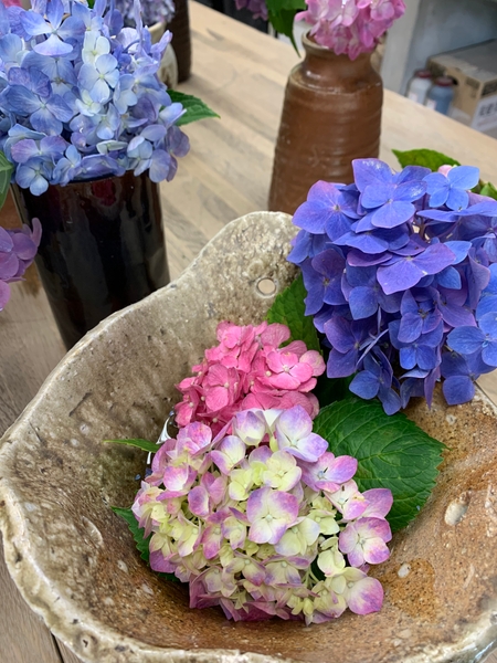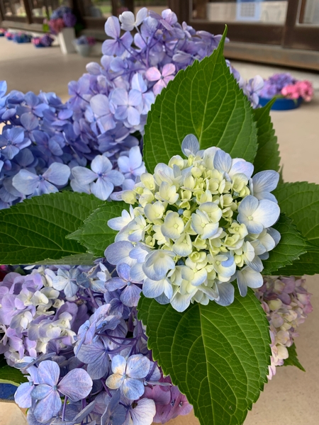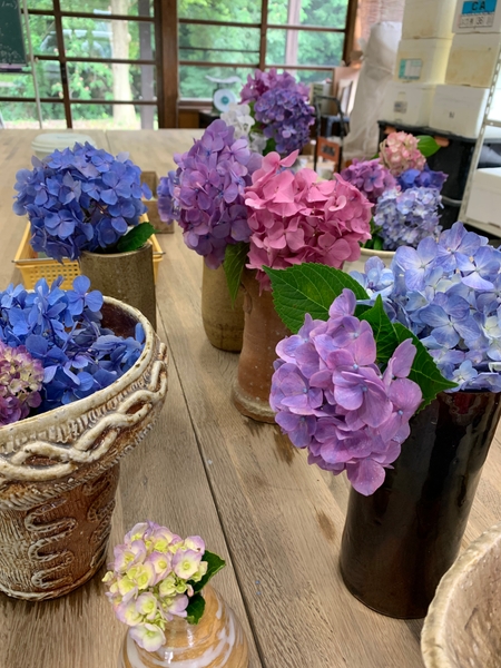 あじさい祭り終了後廃棄予定だったあじさいが、陶芸文化施設射水市陶房「匠の里」を華やかに彩りました。