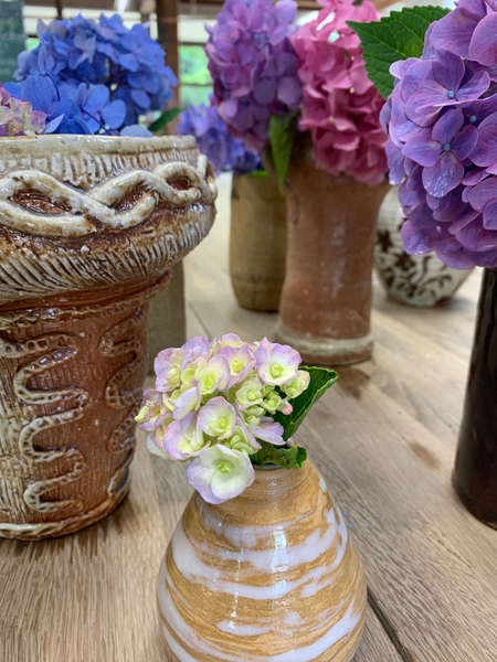 来年再び美しい花を咲かせるために必要なプロセスとはいえ、まだまだ美しく咲いているあじさいたち。JFCではそんなあじさいたちにもう一度輝ける場所をつくりたい、あじさいの美しい姿を少しでも多くの方に見ていただきたいとの想いから、あじさいの剪定作業に参加させていただき、刈り取った約500本のあじさいをJFCが管理運営する射水市陶房「匠の里」に飾りました。工房で製作された花器も使用し、陶芸工房の通路両脇をはじめ工房内各所にあじさいの花が咲き、自然に囲まれた閑静な佇まいの「匠の里」が華やかに彩られました。