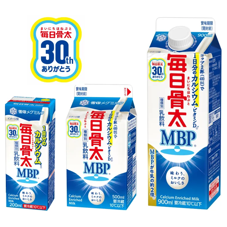 a. 「毎日骨太 MBP(R)」はコップ2杯(400ml)、「毎日骨太 MBP(R) 1日分のカルシウム」は1本(200ml)で、1日分のカルシウムとビタミンD※、牛乳の約2倍のMBP(R)入り。