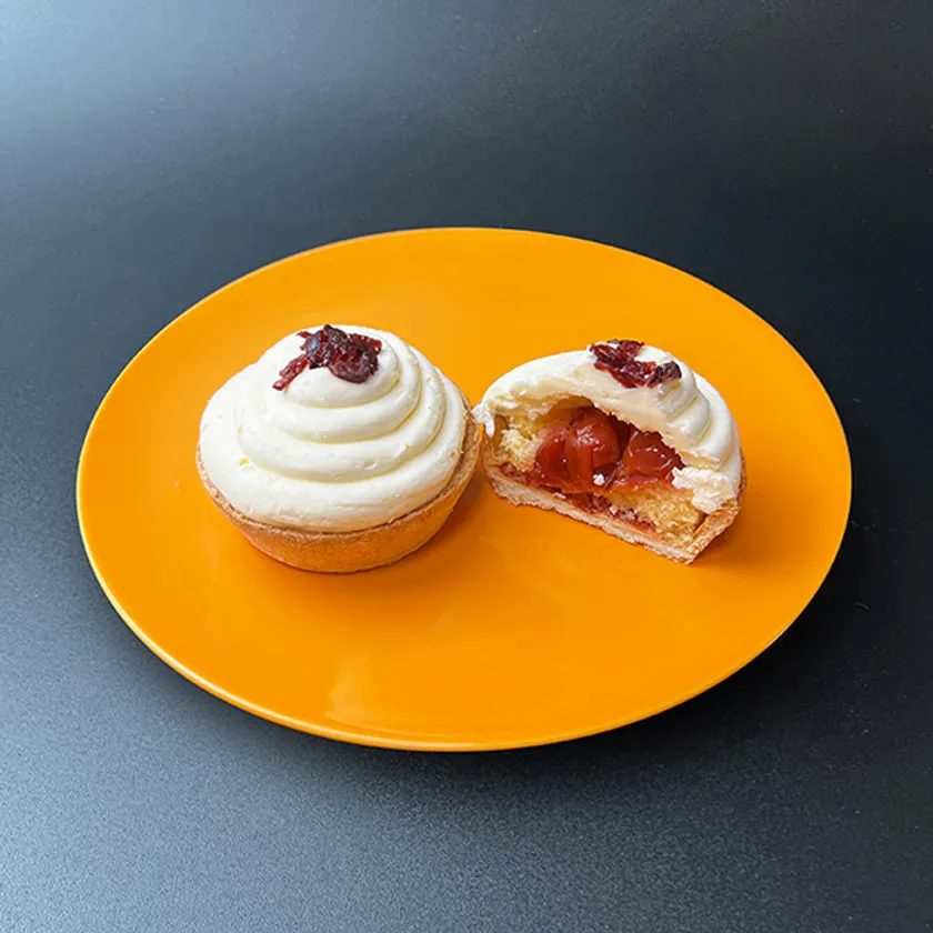 サクサクのパイ生地タルトに、ラズベリージャムを敷いて、スポンジ、サワーチェリー、バタークリーム、クランベリーのドライフルーツを順に乗せました。