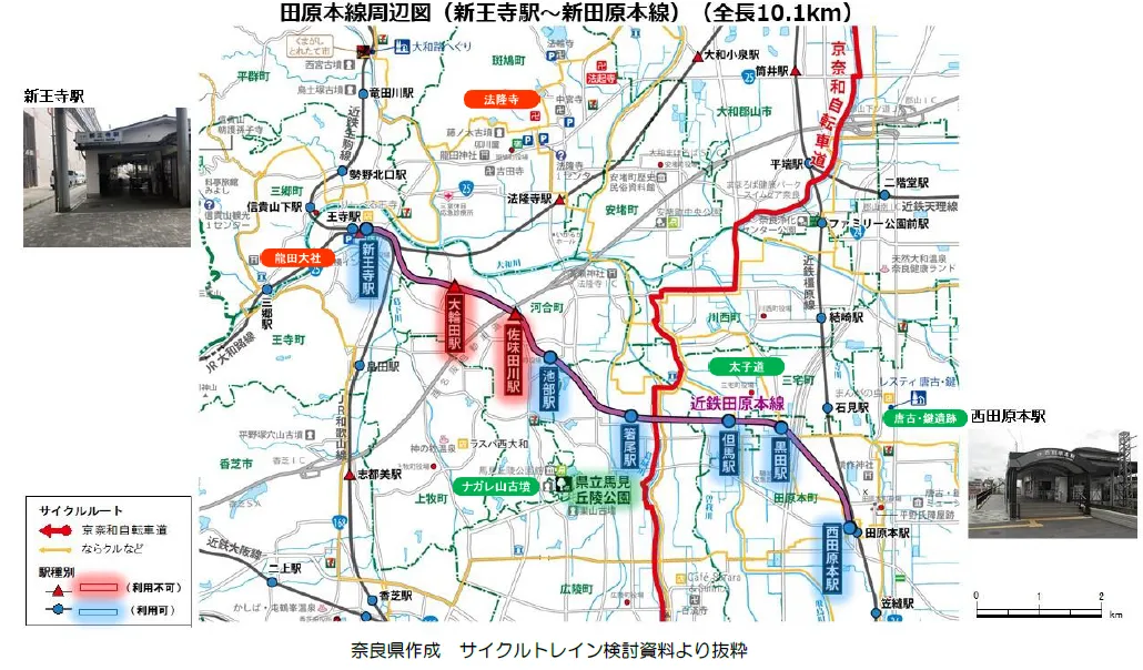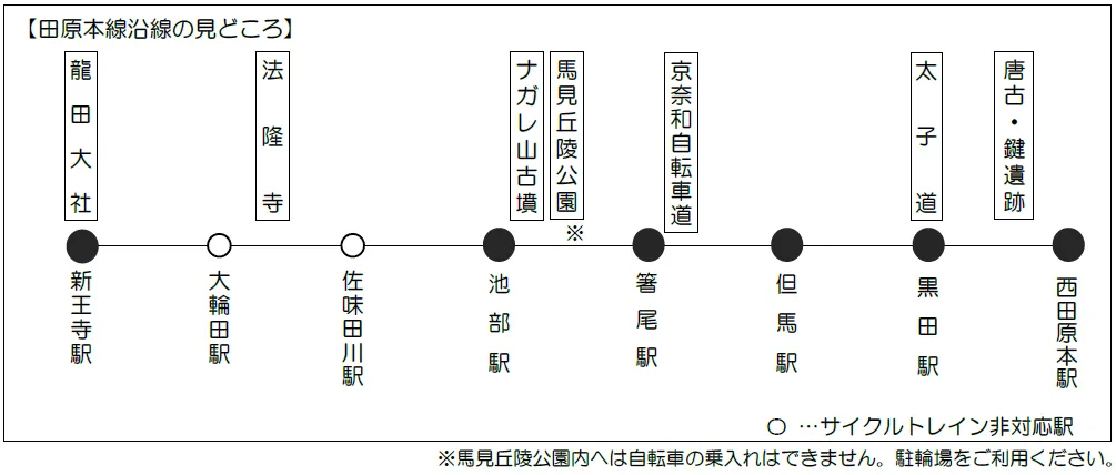 田原本線沿線には、奈良県営馬見丘陵公園や太子道、唐古・鍵遺跡などの見どころが点在しており、田原本線の箸尾駅は京奈和自転車道へのアクセスが便利な駅です。