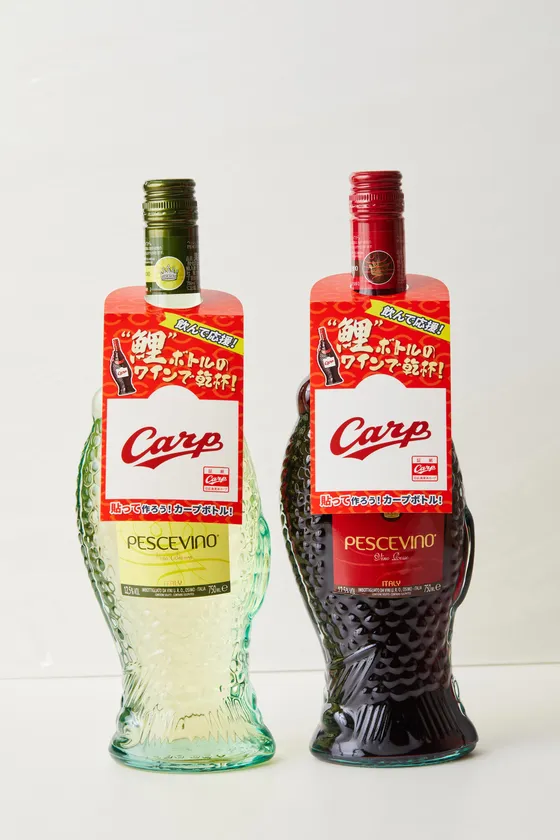 鯉をかたどったボトルが印象的なペッシェヴィーノは、1986年に初めて日本で発売されて以来、イタリアカジュアルワインとして愛されてきました。そして、発売年の1986年といえば、カープがセ・リーグ優勝を果たした年でもあります。そこで、このたびモンテ物産が提案するのは、カープ承認ワインとなったペッシェヴィーノを、カープボトルにデコレーションできる“作るカープボトル”!ペッシェヴィーノに掛けられた専用シールを使って、ワインをご購入いただいたお客様自身でカープロゴ入りボトルにデコレーションしていただけます。ワインを飲んで応援、作って応援、写真に撮って応援!とお好みのスタイルでカープの応援を演出します。
