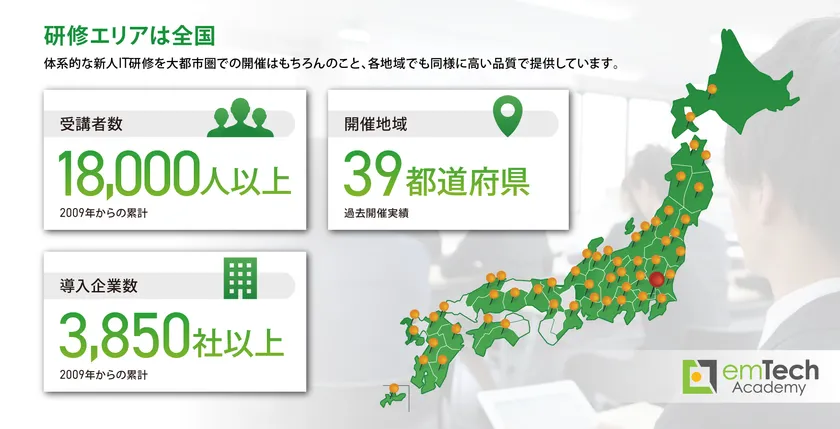 全国28都道府県39地域(詳細は下記)、154会場において1,800名以上の受講者を迎え研修を開講いたします。すべての会場で、十分な講義トレーニングを受けた認定講師と、全国で同一のテキストと教材を用いた質の高いITエンジニア研修を受講できます。また、研修支援システムによる日本全国共通の試験が実施され、知識やスキルの習熟状況を確認できます。