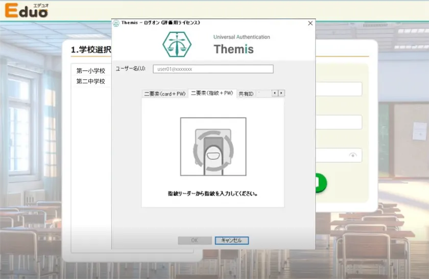 「Themis(テミス)」は、指紋認証をはじめとする生体認証、ICカード認証、パスワード認証など、さまざまな方法による認証を実現する認証基盤です。Windows(Active Directory)、Chrome OS、ネットワーク、アプリケーションなど、幅広いシステムへのログインに対応しています。認証方法とログイン対象を自由に組み合わせて利用することで、システムが要求したセキュリティレベルに応じたそれぞれの認証方法の活用が可能になり、従来の認証と比較して高いセキュリティを保つことができます。教育機関の教職員および児童生徒を対象とした「Themisスクールパック」を提供しております。