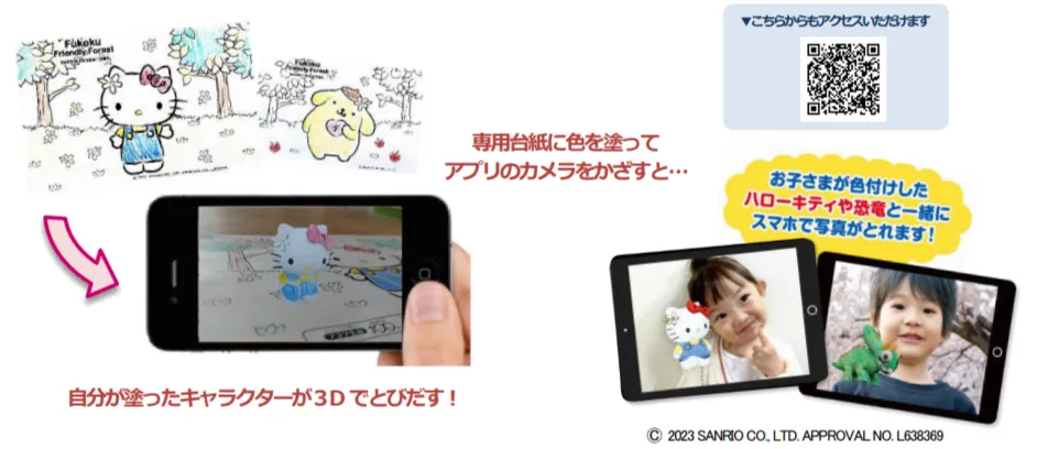 フコク生命の子育て支援サービス「フコク赤ちゃん&キッズクラブ」では、4月3日から会員向けキャンペーンとして「とびだすぬりえプレゼント」を予定しており、本アプリにてサンリオのキャラクターの3Dぬりえが無料でお楽しみいただけます※1。昨年に続き 2回目の実施となる本施策では、ご好評にお応えし提供コンテンツを拡大するとともに、フコク生命の100周年を記念して制作された「フコクフレンドリーフォレスト」に連動した限定デザインになっており、5種類の台紙を並べると背景が1枚の絵のように繋がります。併せてネオス社オリジナルの恐竜の3Dぬりえもご用意し、お子さまに人気のキャラクターコンテンツをフックとした施策を通じて、サービス付加価値の創出および利用者拡大を支援してまいります。