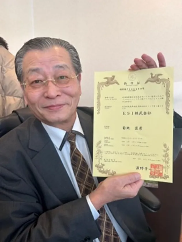 特許証を掲げるESI株式会社 菊地社長