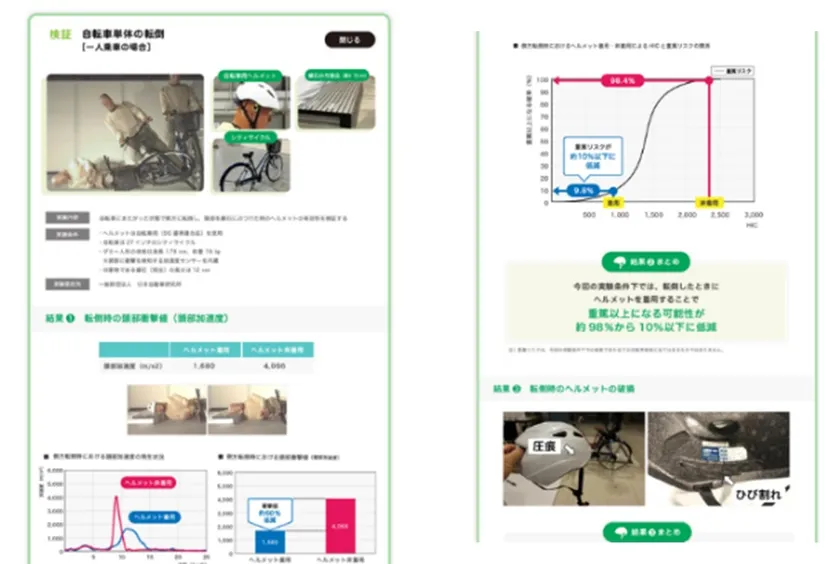 さらに一般財団法人 日本自動車研究所(JARI)に委託した「自転車対自動車の衝突実験、自転車単体の転倒実験、自転車の壁面衝突実験」の実験結果レポートも制作。ヘルメットがどれだけ重要な役割を果たしているかを数値化するとともに、ヘルメット着用の有効性および必要性を信頼できるデータとして3月29日に公開しました。