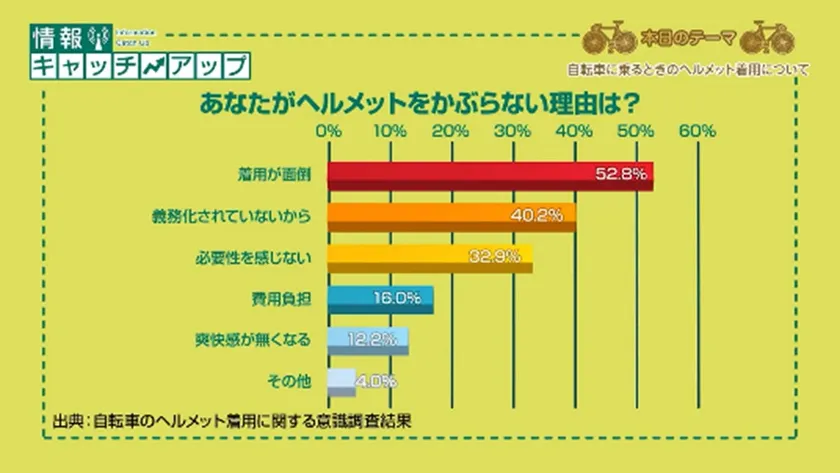 自転車のヘルメット着用に関する意識調査では、着用が面倒であることがトップの回答として示されています。