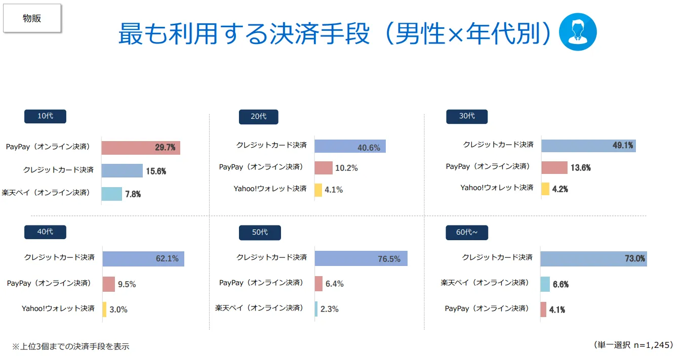 ・20~40代男性は「Yahoo!ウォレット決済」、10~40代女性は「楽天ペイ(オンライン決済)」の人気が他の世代と比較して高い