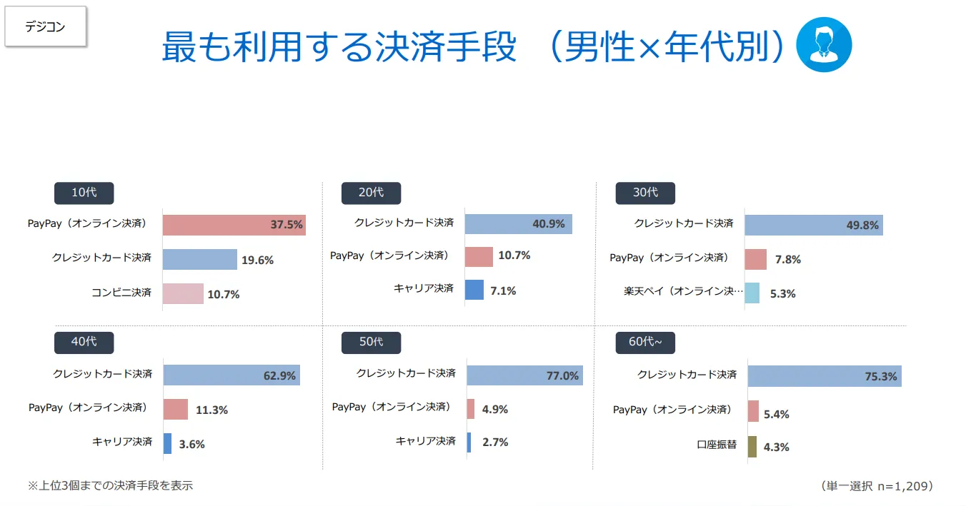 ECサイトで物品もしくはデジタルコンテンツを購入する際、よく利用する決済手段について尋ねたところ、男女ともに1位が「クレジットカード決済」(約60%)、2位が「PayPay(オンライン決済)」(約24%)、3位が「楽天ペイ(オンライン決済)」(約12%)という結果になりました。