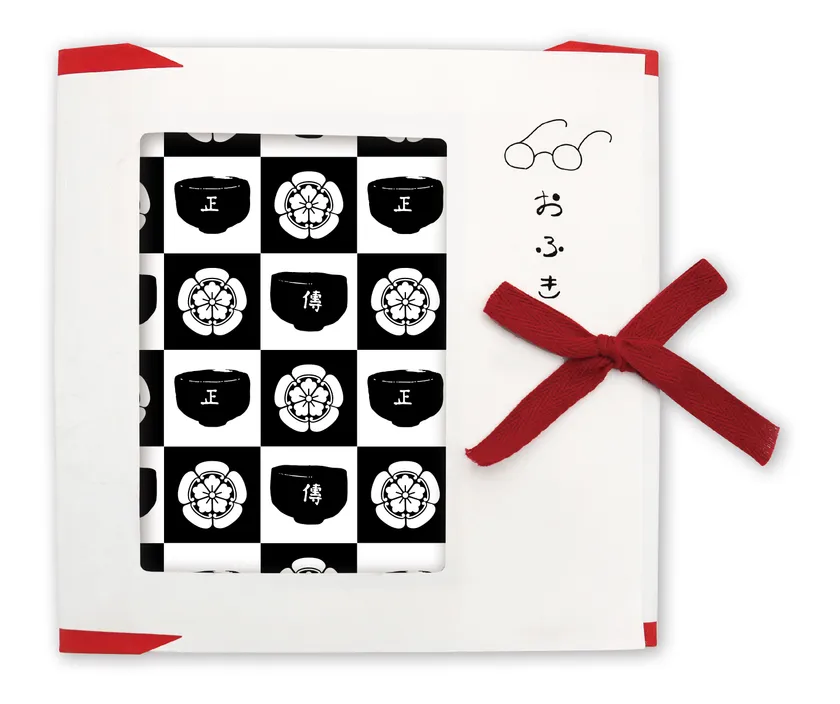黒楽「正傳院」字茶碗(伝仁阿弥道八)と家紋をモチーフにした、「大名茶人 織田有楽斎」展オリジナルデザインの京友禅手染め絹の眼鏡拭き「おふき」付きチケットを京都展のみセブンチケット限定で販売します。