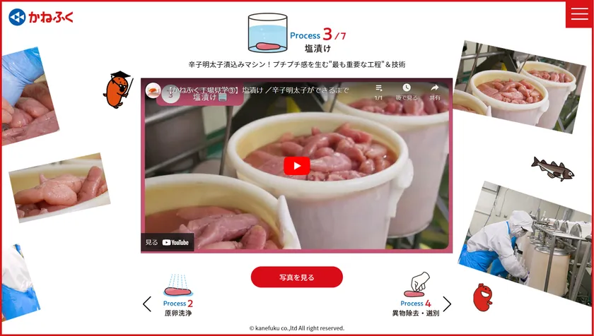 「実は手作業80%!?」「もともとは粒々がないって本当!?」「辛子明太子は工場で回っている!?」など、初めて知る内容が盛りだくさん。工場の内部を公開し、普段食べている辛子明太子がどのようにつくられるのかを学ぶことができるコンテンツになっています。