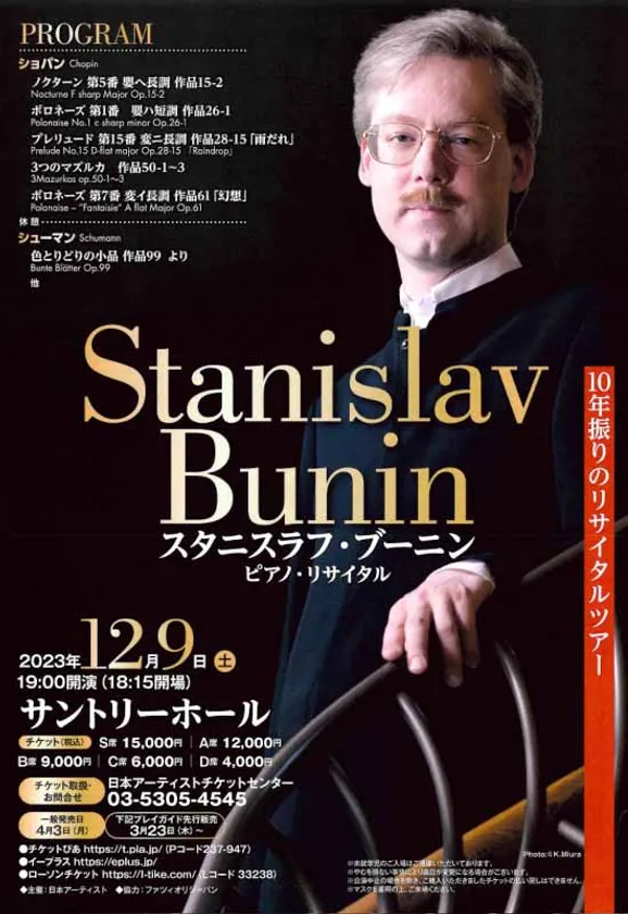 株式会社日本アーティストは、2023年11月~2024年1月に、第11回ショパン国際ピアノコンクールの覇者であり世界最高峰のピアニストと称されるスタニスラフ・ブーニンの、10年ぶりとなる日本での全国ツアーを開催します。