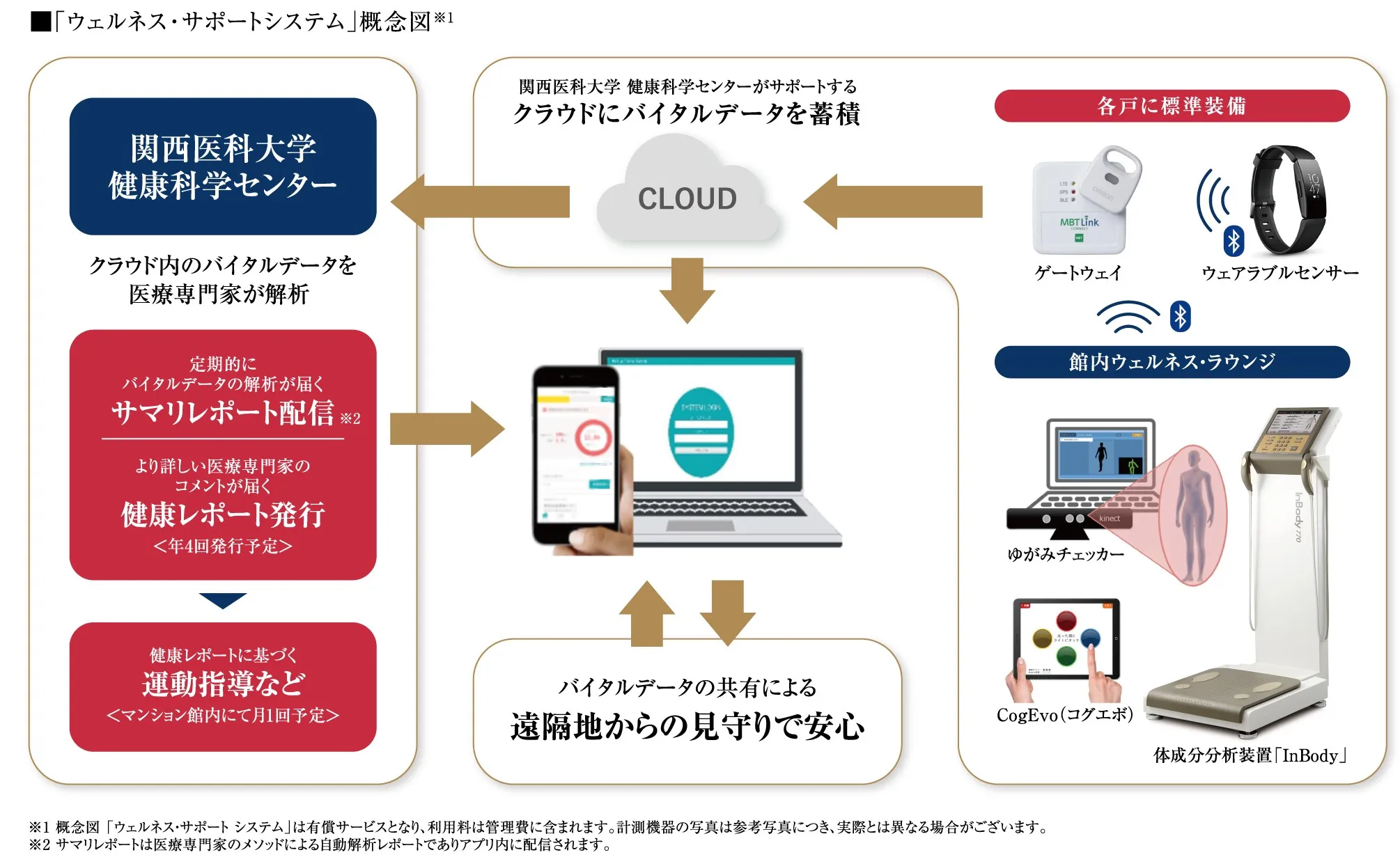 日々のバイタルデータを最新測定機器から収集・管理、各自の健康状況の変化をチェックし、関西医科大学健康科学センターがレポートを発行。館内にて健康指導やセミナーなどを実施。