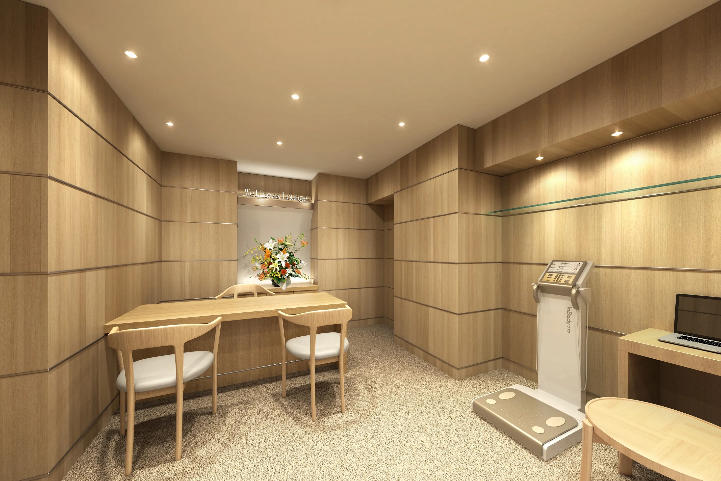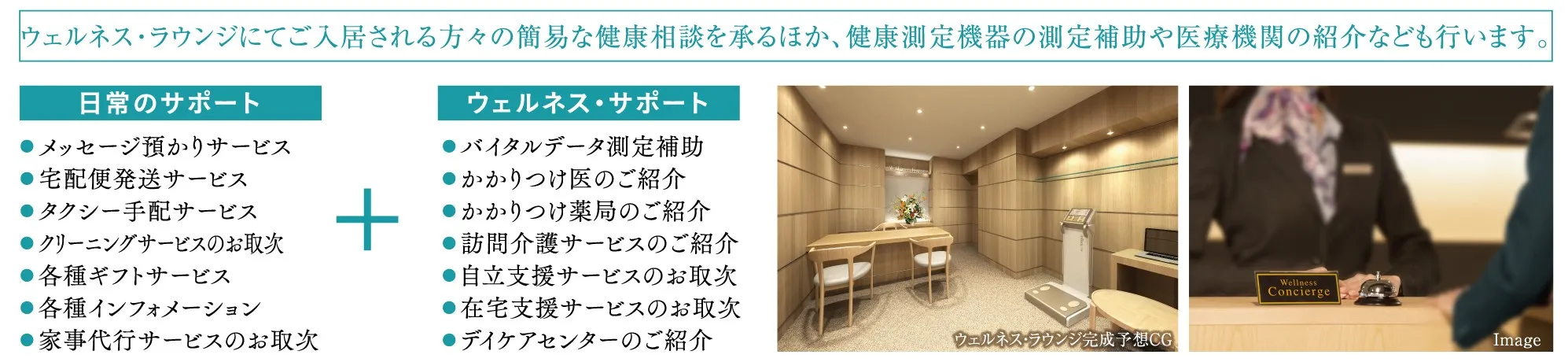 人生100年時代を迎え、予防医療への関心とニーズが高まりつつあります。高齢者による移動困難等による受診機会の減少もあって健康不安や実際の健康リスクも大きくなっているのが現状です。今後益々高まるであろう健康管理環境の観点から開発されたのが「ウェルネス・サポートシステム」です。マンション館内のウェルネス・ラウンジに設置された最新健康測定機器や各戸に標準装備されたウェアラブルデバイスを通じて日常のバイタルデータを測定。日々の暮らしに寄り添うウェルネス・コンシェルジュが、ウェルネス・ラウンジにて入居者の健康管理をサポート。また、健康レポートに基づいた健康指導やプログラムも館内施設にて開催します。