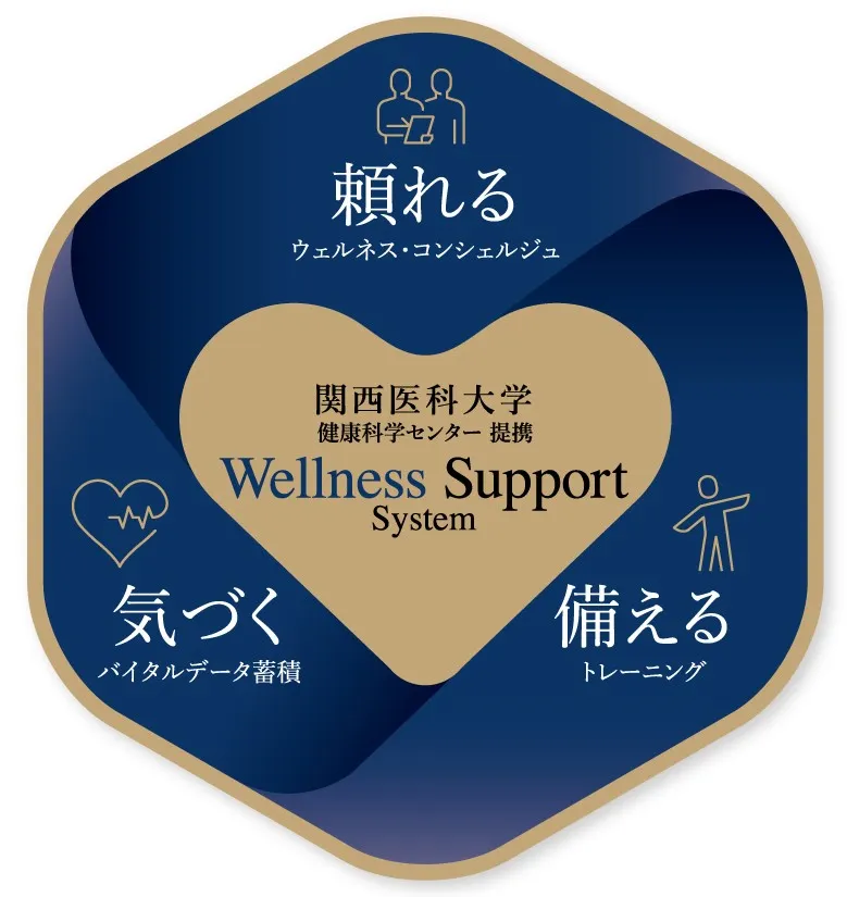 身体に変調を感じてから医師に相談したり医療機関にかかるよりも、日常の生活習慣をチェックしながら病気を予防したり、健康を維持する。それは「ウェルネス・サポートシステム」のコンセプトです。「気軽に『頼れる』、自分の体調に『気づく』、健康不安に『備える』」。3つのサポートが健康長寿のための健康サポートを実現します。