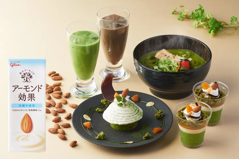 江崎グリコの『アーモンド効果(R)』を使用した宇治抹茶スイーツやドリンク等が、伊藤久右衛門各店に期間限定で登場いたします!フェア商品は「宇治抹茶とアーモンドミルクのブランマンジェ」「宇治抹茶&宇治ほうじ茶アーモンドミルクラテ」「宇治抹茶とアーモンドミルクのクリーミーカレーうどん」「宇治抹茶アシェット・デセール ~アーモンドの惑星~」の全5種。
