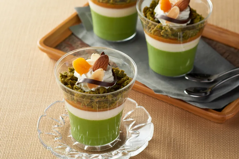 宇治抹茶とアーモンドミルクの2層のブランマンジェに、甘酸っぱいアプリコットゼリーを重ねました。なめらかでやさしい口あたり、アーモンドの香ばしさ、抹茶との特別なハーモニーをお楽しみください。宇治本店にて販売いたします。