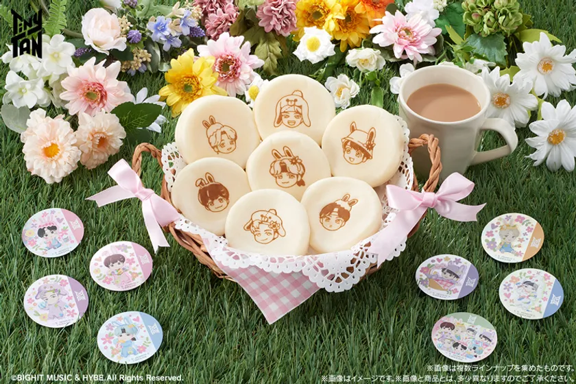 まんまるの生地の中にクリームが入ったバンダイの人気商品“まんまる焼き”シリーズと、「TinyTAN」初の商品です。本商品は白いもちもち生地で甘酸っぱいいちご味のクリームを包み、生地表面には全7種の焼き印を施しました。1枚付属するシールは、各キャラクター単体デザイン7種、集合デザイン1種の全8種で、シールは店頭でお好きな絵柄を選ぶことができます。また本商品のデザインは全て「TinyTAN」がうさぎの被り物を付けた春らしい限定の描き下ろしデザイン!春のおでかけやおやつにぴったりの商品です。