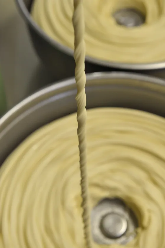 オカベでは、徳島県の半田地域に約300年前から伝わる半田そうめんの伝統製法に加えて、“ねじり”をしっかり効かせているところがポイントです。この工程により、麺の組織がらせん状になり、コシが強くのど越しの良い麺ができあがります。