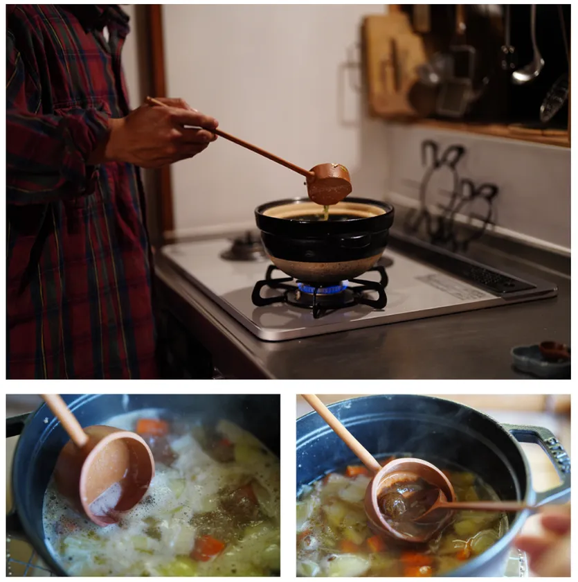 底が平らで、まっすぐ長いOTATE。お玉としてはもちろん、アクをすくったり、ルーやお味噌を少しずつ溶かすときにも。