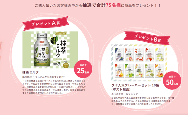 また、対象の母の日商品をご購入いただいた方の中から抽選で75名様に、「抹茶ミルク」や「グミ人気フレーバーセット」など、豪華商品が当たるキャンペーンを行います。