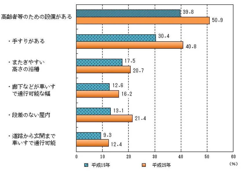 総務省「住宅・土地統計調査」によると、トイレや浴室に手すりがあるなど一定のバリアフリー設備のある住宅は全体の50.9%とまだまだ低いことがわかります。