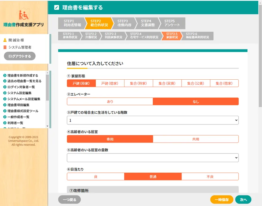 ・病状や生活状況を選択しながら住宅改修理由書の作成を支援するアプリ『FUS III』