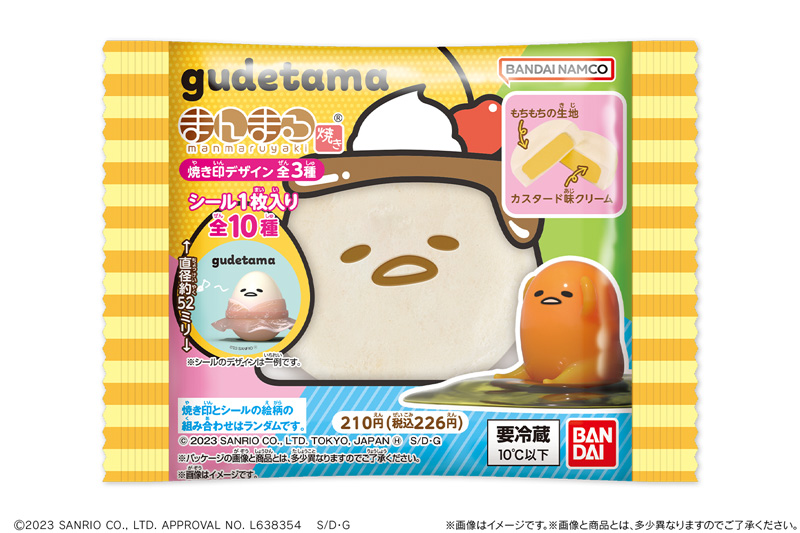 まんまるの生地の中にクリームが入ったバンダイの人気商品“まんまる焼き”シリーズと、2023年でデビュー10周年を迎えたぐでぐでとしたやる気のないたまご『ぐでたま』の初のコラボ商品です。本商品は白いまんまる生地でカスタード味のクリームを包み、生地表面には今にも「だりぃ~」と声が聞こえてきそうな全3種の『ぐでたま』の表情の焼き印を施しました。カスタード味クリームは『ぐでたま』にちなみ、従来のもの(※)よりも卵の風味を際立たせました。一口食べれば卵のコクが口いっぱいに広がります。おまけに1枚付属するまんまるシールは、『ぐでたま』の他にも『しゃきぴよ』や『牛魔王ぐでたま』など、Netflix配信アニメに登場する個性豊かな仲間たちのデザインが全10種。どのシールに出会えるかは袋を開けてからのお楽しみです。