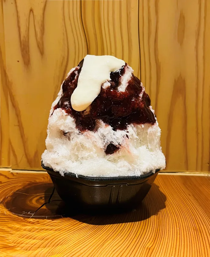 練乳と手作りの甘酸っぱいカシスにマスカルポーネのホイップをのせたかき氷。