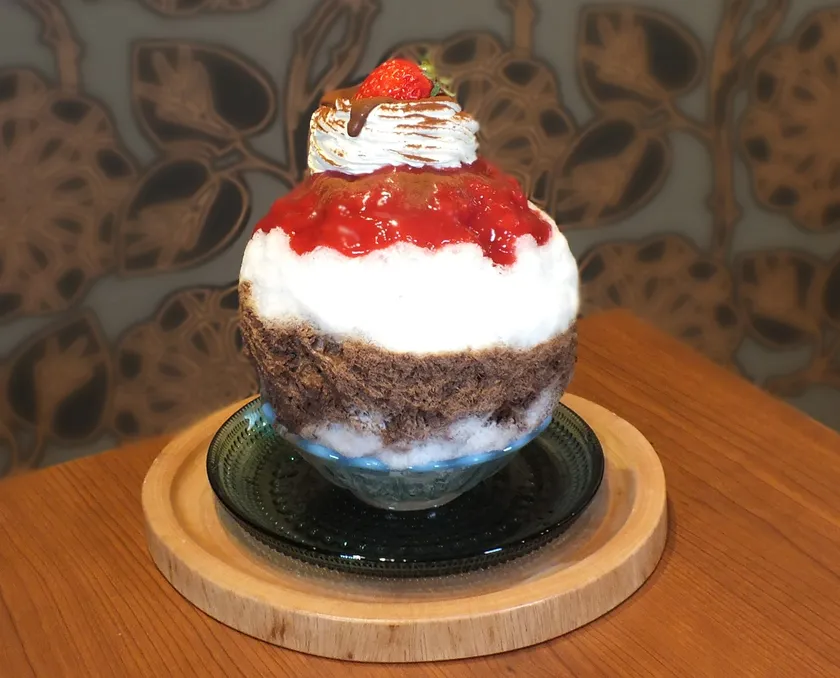 とろとろチョコレートに、甘酸っぱいストロベリーソースを合わせたケーキのようなかき氷。