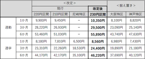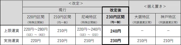 同調運賃区間である大阪・神戸特区を除く全線の上限運賃を240円へ変更。
