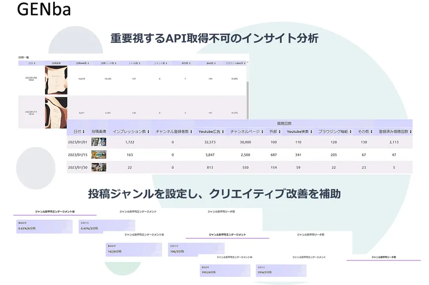 ・APIで取得できるインサイトは限られていますが、当社の分析実績から重要視する取得不可のインサイトも利用し、独自の分析能力を発揮するツールです。