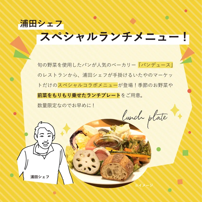 旬の野菜を使用したパンが人気のベーカリー「パンデュース」のレストランから、浦田シェフが手掛けるいたやのマーケットだけのスペシャルコラボメニューが登場!